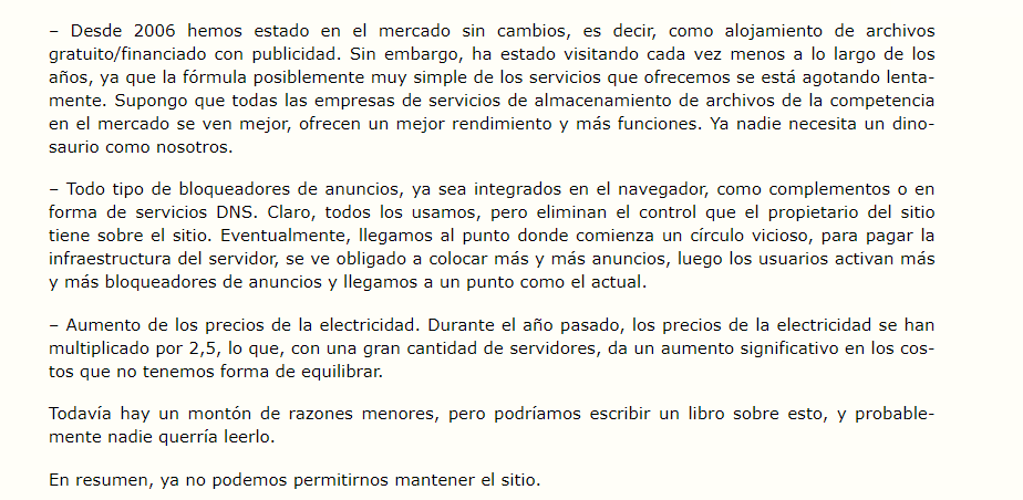 A pesar de que Zippyshare permanecerá en línea sin cambios durante las próximas dos semanas, sus usuarios deben buscar alternativas en otros servicios de alojamiento de archivos.